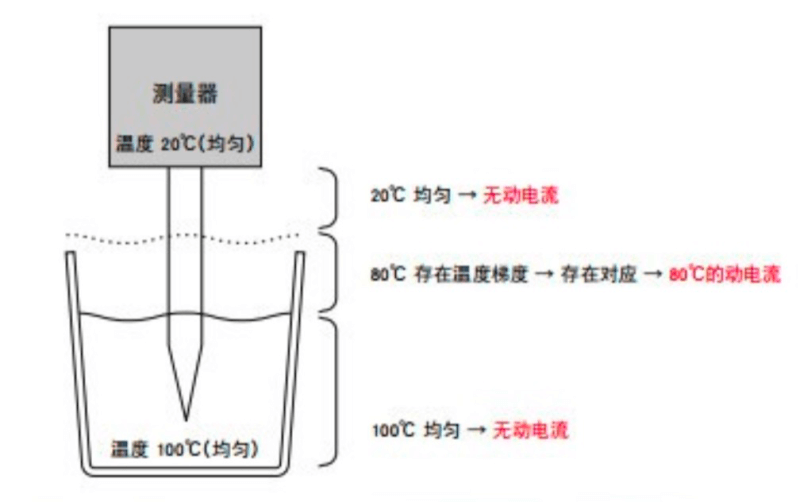 如上图所示,液体内部的热电偶部分不会产生热电动势,热电动势只存在于有温度梯度的部分。