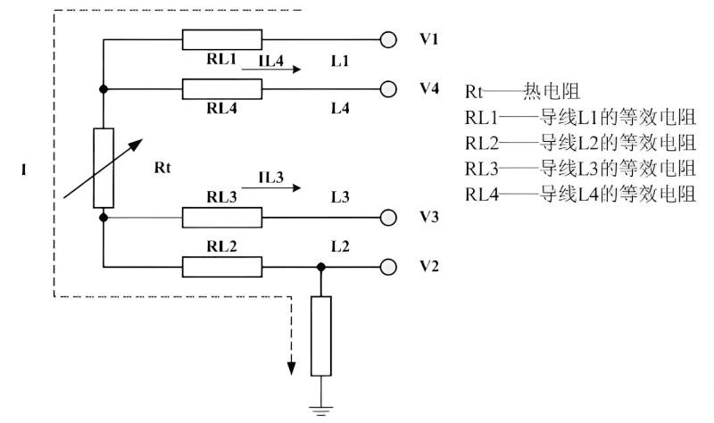 热电阻的引出线一般分为两线制,三线制,四线制,其原因在于需要测量更精准的电阻值。四线制的连接测量简图如下: